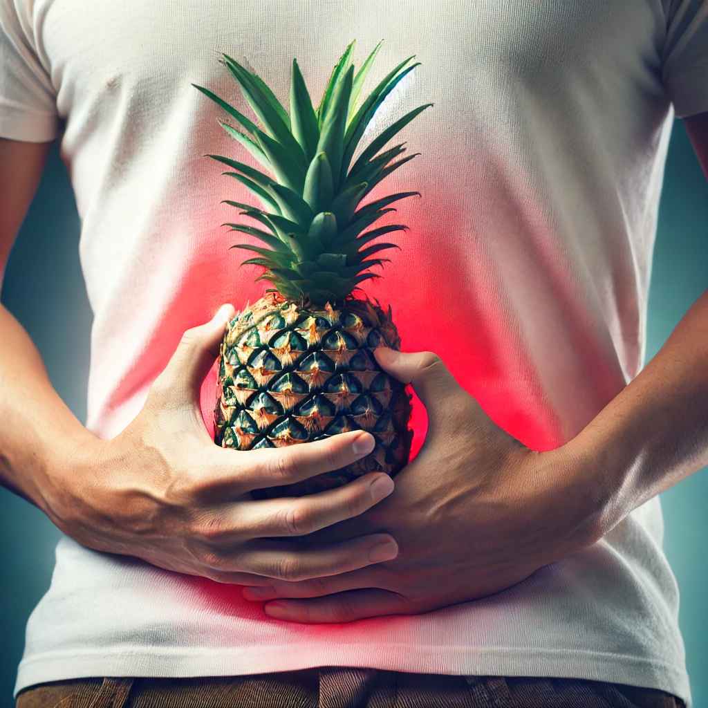 파인애플에 포함된 브로멜라인 효소는 소화와 염증 완화에 도움을 줍니다. 단백질 소화를 돕는 이 효소는 육류 섭취 후 소화를 원활하게 하고, 장 염증을 줄이며 설사를 방지합니다.